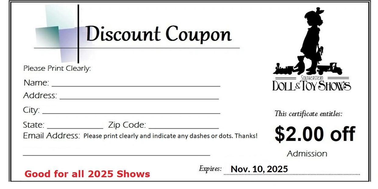 Event tickets for any Southeastern Doll Show are available to purchase at the door of the show. Admission is $8.00 for Adults - Children 12 and under are FREE. This coupon is good for $2.00 off the admission price for any 2025 show.